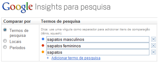 Certa vez a Nathalia detalhou em um artigo o funcionamento do Google Insights e o que eu mais gosto da ferramenta é que você consegue estimar o tráfego de palavras-chave, baseando em palavras que você já está em primeiro. Por exemplo, você é o primeiro lugar para a palavra-chave “sapatos masculinos” e deseja saber o volume de tráfego que o seu concorrente possui por ser o primeiro lugar para a palavra-chave “sapatos femininos”.