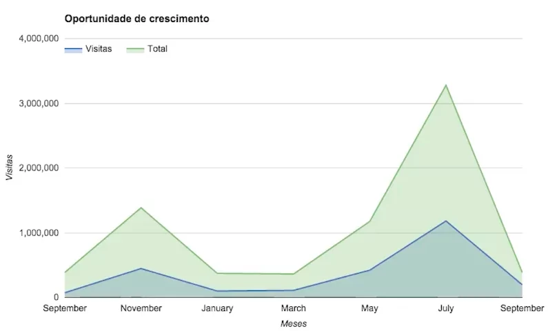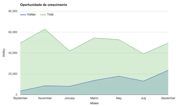 O valor de obter esta projeção em gráfico é que você encontra a oportunidade de crescimento e quantos leads/vendas são perdidos por não ter estratégias de SEO incorporadas às estratégias de marketing. Nada melhor do que “oportunidades perdidas” (ou a serem conquistadas), para ganhar a atenção de quem precisa ter os resultados e performance do site ampliados.