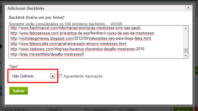 Copie a listagem de URLs obtidas e cole na WebXTool. No cadastro, a título de organização, você pode informar o tipo do backlink, em nosso caso escolhemos o “Não definido”. A opção “Aguardando Aprovação” deverá permanecer desmarcada (se você marcar, o sistema não fará a busca pelo backlink).