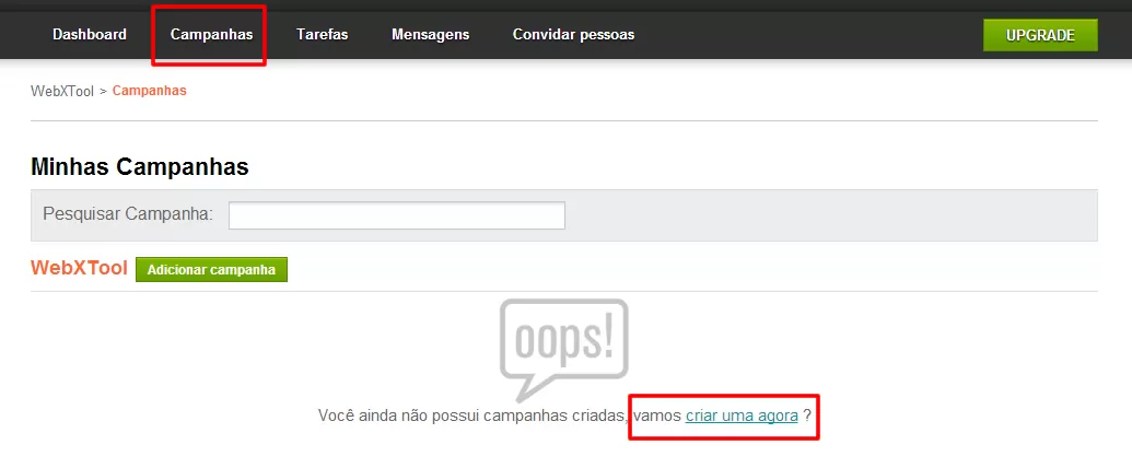 Para criar uma conta gratuita, acesse: http://webxtool.com/users/new?p=1 e siga as instruções enviadas por e-mail. Após preencher as informações iniciais, crie uma campanha na ferramenta. Para isso, clique em “Campanhas” e adicione uma nova campanha a sua conta.