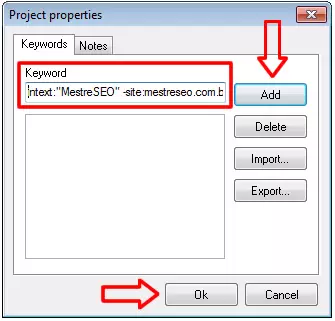 Após cadastrar a URL, você já pode inserir palavras-chave. A fim de encontrar pessoas que mencionam nossa marca, faremos uso da seguinte string => intext:”MestreSEO” -site:mestreseo.com.br (Com isso, vamos obter todos os sites que citam a marca MestreSEO, com excessão do domínio mestreseo.com.br). Neste ponto você deve substituir “MestreSEO” pela sua marca e “mestreseo.com.br” pelo seu domínio.