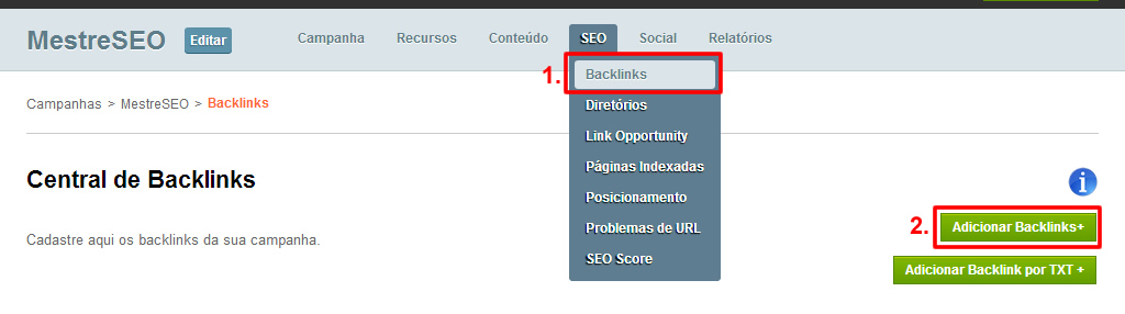 Com a campanha criada, é hora de cadastrar as URLs obtidas através da Free Monitor for Google. Para isso, acesse sua campanha e vá em SEO > Backlinks > Adicionar Backlinks