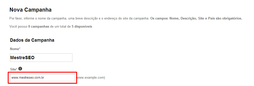 Depois disso, você precisa cadastrar a URL do seu site. Em nosso exemplo, iremos cadastrar o site www.mestreseo.com.br