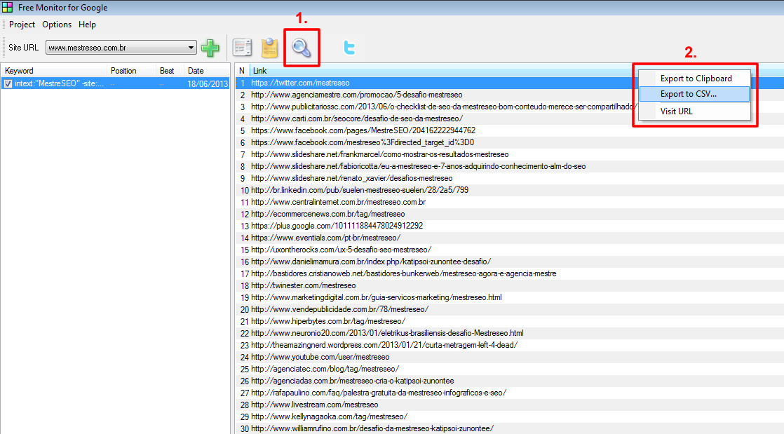 Para dar início ao processo, precisamos coletar as URLs que mencionam nossa marca. Para isso, utilizaremos a ferramenta Free Monitor for Google (Você pode fazer o download gratuito aqui)
