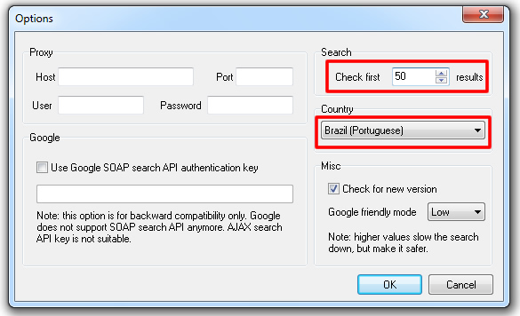 Depois de instalar a ferramenta Free Monitor for Google, clique no menu Options > Preferences e certifique-se de obter, pelo menos, os 50 primeiros resultados (Check first 50 results) e que os resultados retornarão dados do Google Brasil (Country Brazil Portuguese).