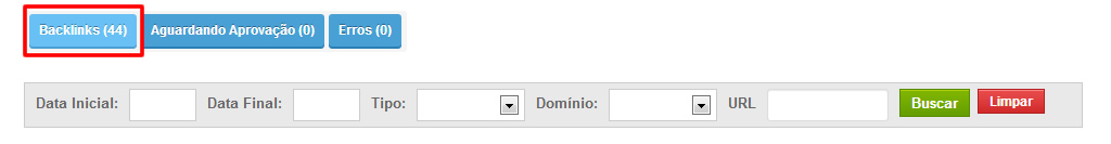 A partir daí, a ferramenta fará todo o trabalho de verificação para você. No módulo de backlinks, existem três abas de navegação: “Backlinks”, “Aguardando Aprovação” e “Erros”. É importante notar, que imediatamente após o cadastro, todos os backlinks cadastrados ficarão na aba “Backlinks”, pois ainda não foram verificados.
