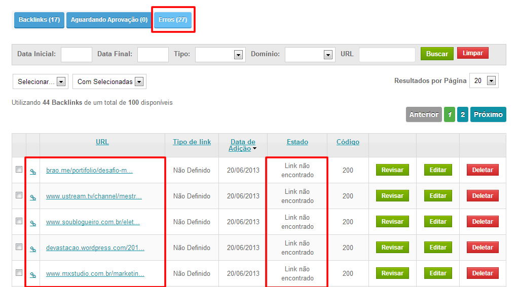 Chegamos finalmente a parte mais importante do processo! Das 44 URLs cadastradas, 27 retornaram erro (o que pode indicar que não existe um link para o seu domínio ou que existe algum problema na URL analisada).
