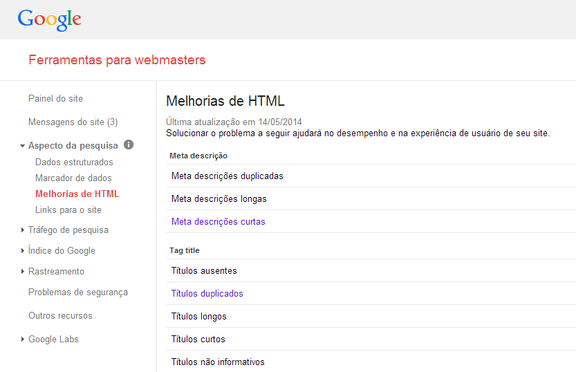 Nesta área o Google mostra a quantidade de meta descriptions duplicadas, além de mostrar quais são estas páginas. O mesmo é válido para títulos, onde ele indica ainda se existem títulos longos de mais.