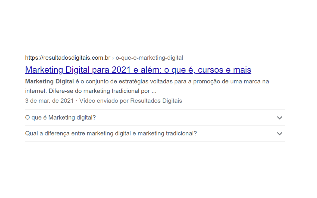 As páginas que contêm essa marcação apresentam uma lista com as perguntas relacionadas ao assunto apresentado. O Google classifica esse rich snippet como resultado aprimorado, pois, ele facilita que o buscador encontre as respostas para as pesquisas realizadas através do Google Assistente.