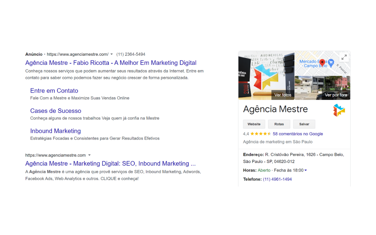Além disso, temos o painel de conhecimento do Google, mostrado à direita nas SERPs. Esse recurso, que pode ser construído através de um perfil profissional no Google My Business, também é um recurso valioso para alcançar melhores resultados no buscador, pois ele contém as informações mais importantes sobre o seu negócio.