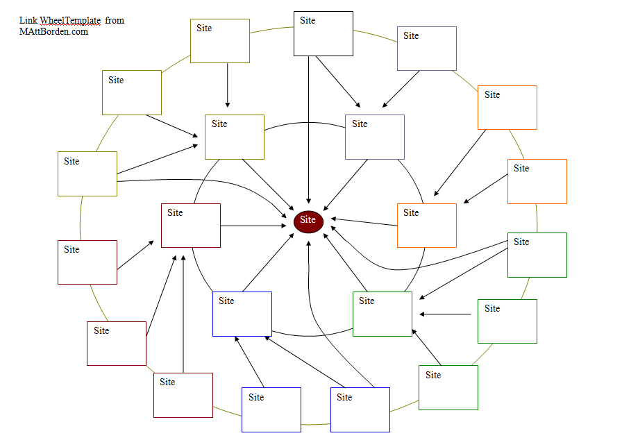 A link wheel é uma estratégia que é utilizada para manipular o PageRank, onde você cria diversos websites e páginas na web, com a finalidade de fortalecer um ou um grupo de website que lhe pertence. Um simples exemplo de uma link wheel seria criar diversos blogs no WordPress.com, no Blogspot.com e no Tumblr.com, e ao criar artigos dentro deles, você faria sempre links entre estes blogs e também para o seu website principal.