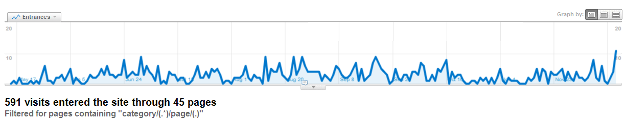 Apesar desse esforço, vejo que não é a solução ideal, pois como você pode ver abaixo, temos um baixo tráfego (entre 10-20 visitas dia) para páginas paginadas.