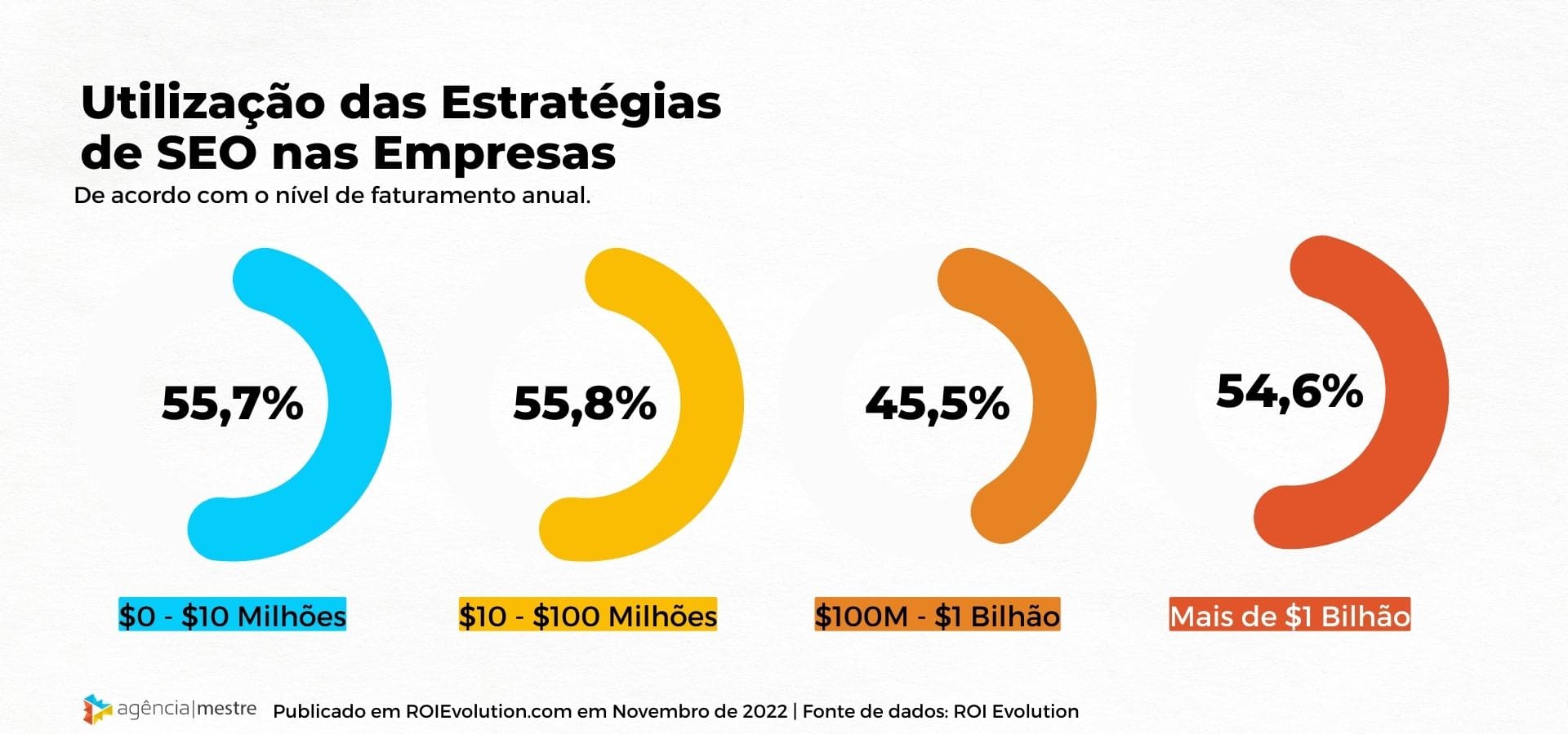 Para entender melhor o papel da estratégia de SEO em diferentes níveis empresariais, a ROI Evolution segmentou a utilização dessas técnicas de acordo com o faturamento anual da empresa: