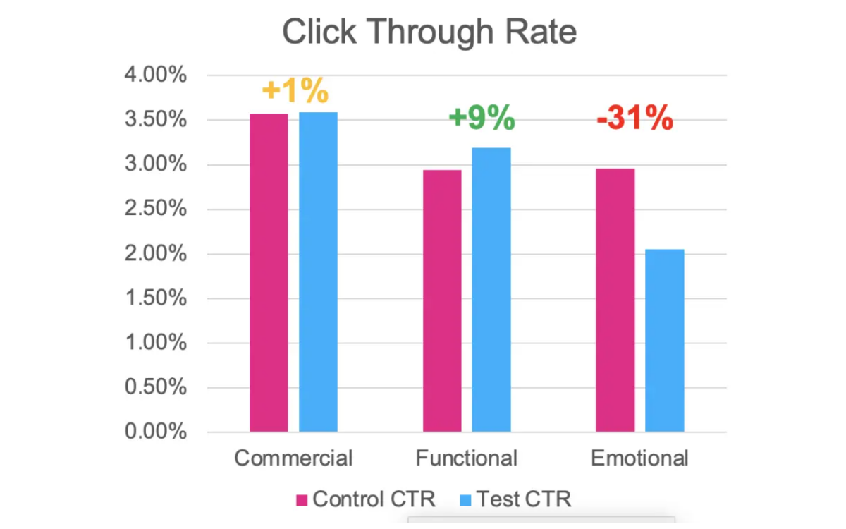 Os clientes responderam melhor ao grupo de copy funcional. Enquanto a copy emocional, foi um fracasso, reduzindo em -31% o CTR.