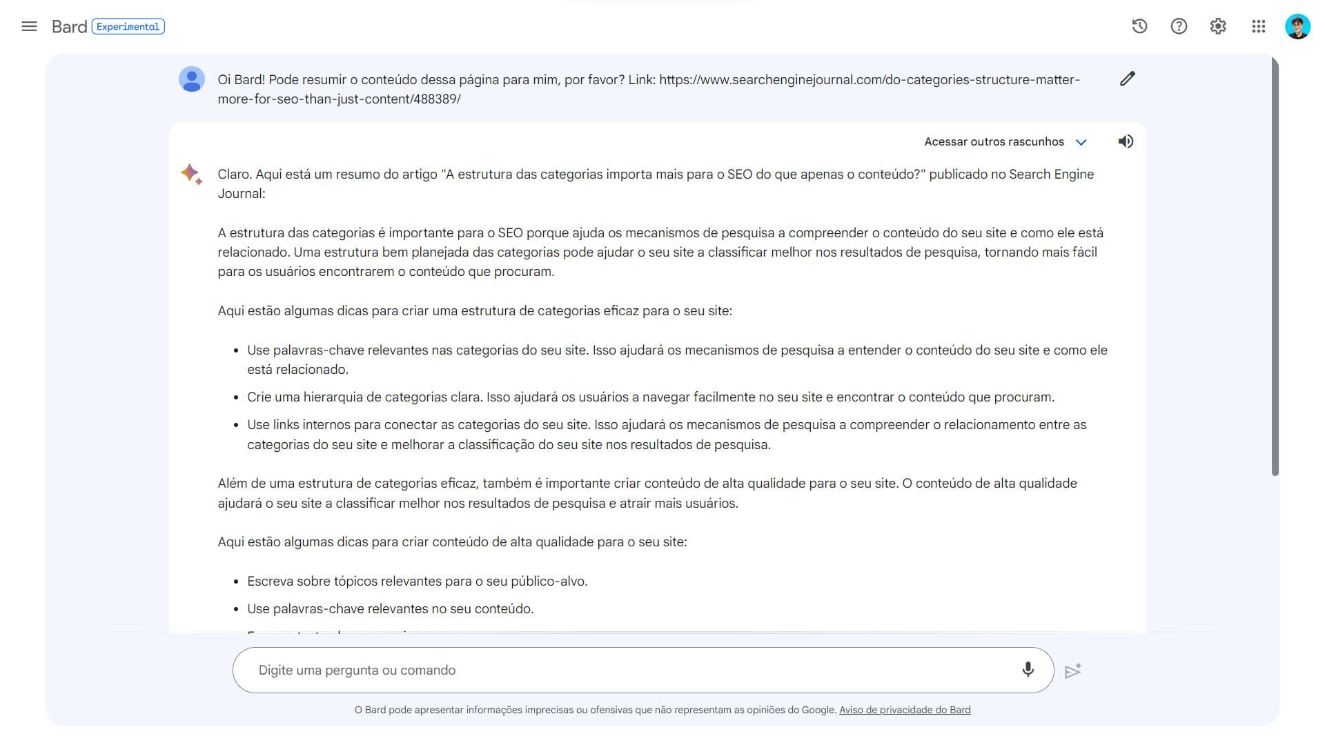 Pedimos que os dois chatbots resumissem o conteúdo de um artigo publicado no blog Search Engine Journal, intitulado “A estrutura das categorias importa mais para o SEO do que apenas o conteúdo?”