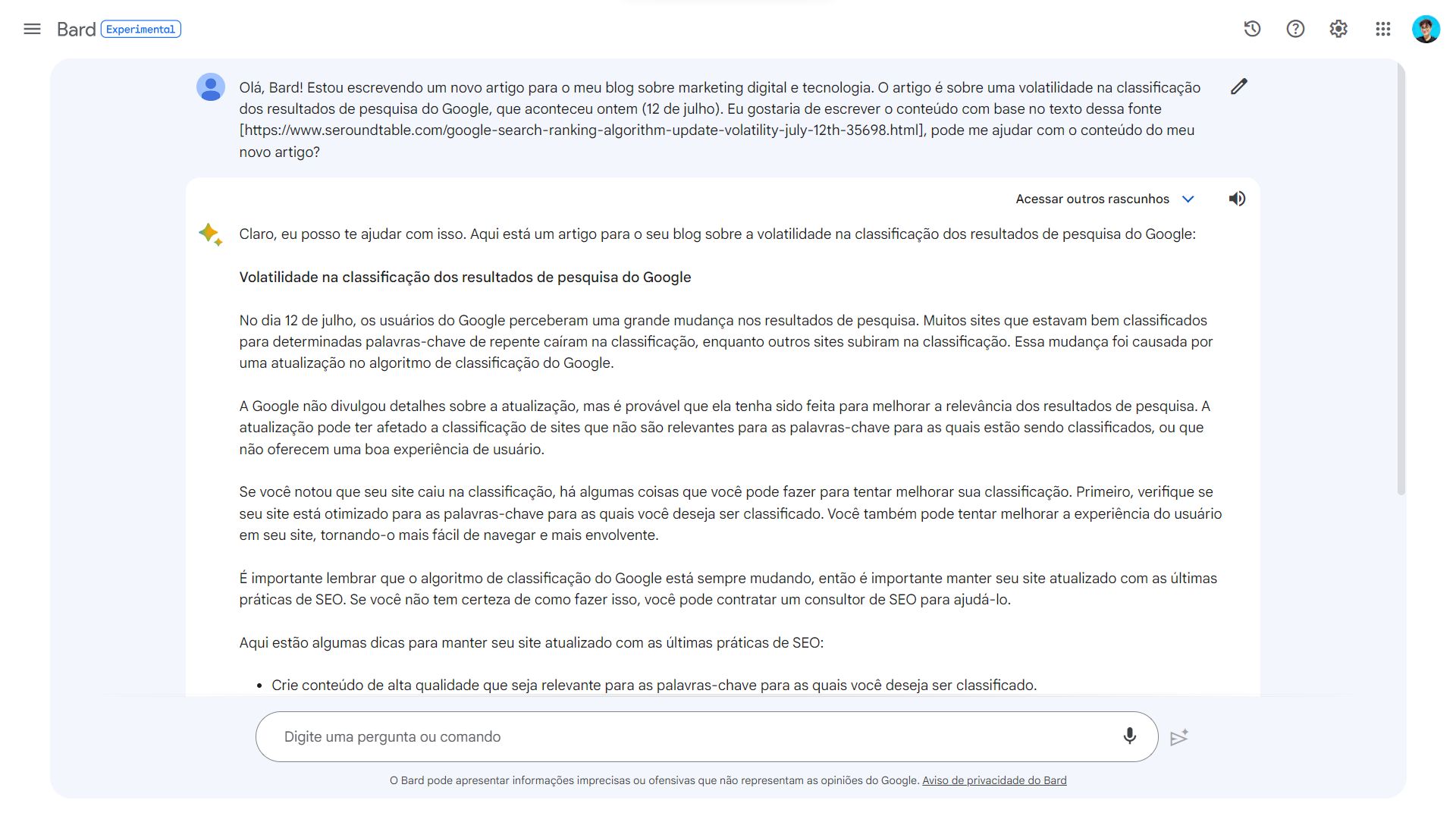 “Olá, Bard! Estou escrevendo um novo artigo para o meu blog sobre marketing digital e tecnologia. O artigo é sobre uma volatilidade na classificação dos resultados de pesquisa do Google, que aconteceu ontem (12 de julho). Eu gostaria de escrever o conteúdo com base no texto dessa fonte [https://www.seroundtable.com/google-search-ranking-algorithm-update-volatility-july-12th-35698.html], pode me ajudar com o conteúdo do meu novo artigo?”