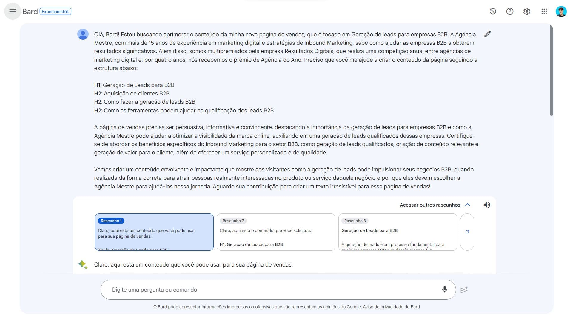 Assim como em todas as suas respostas, o Bard forneceu três sugestões de “Rascunho”, que podem ser compiladas no seu conteúdo para torná-lo ainda mais relevante e personalizado.