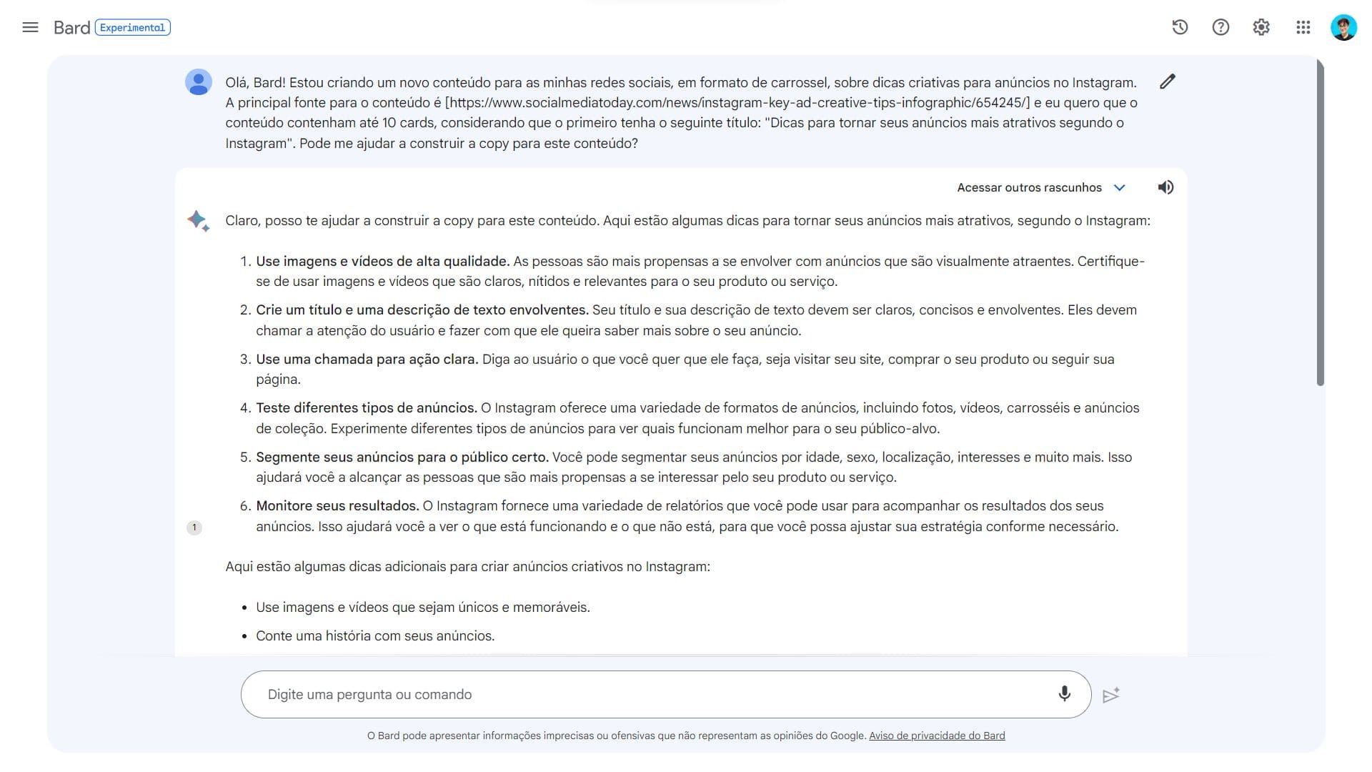 Novamente, isso reforça a importância de revisar os conteúdos produzidos antes de realizar a publicação, principalmente nesses primeiros meses em que o Bard está disponível na versão experimental.