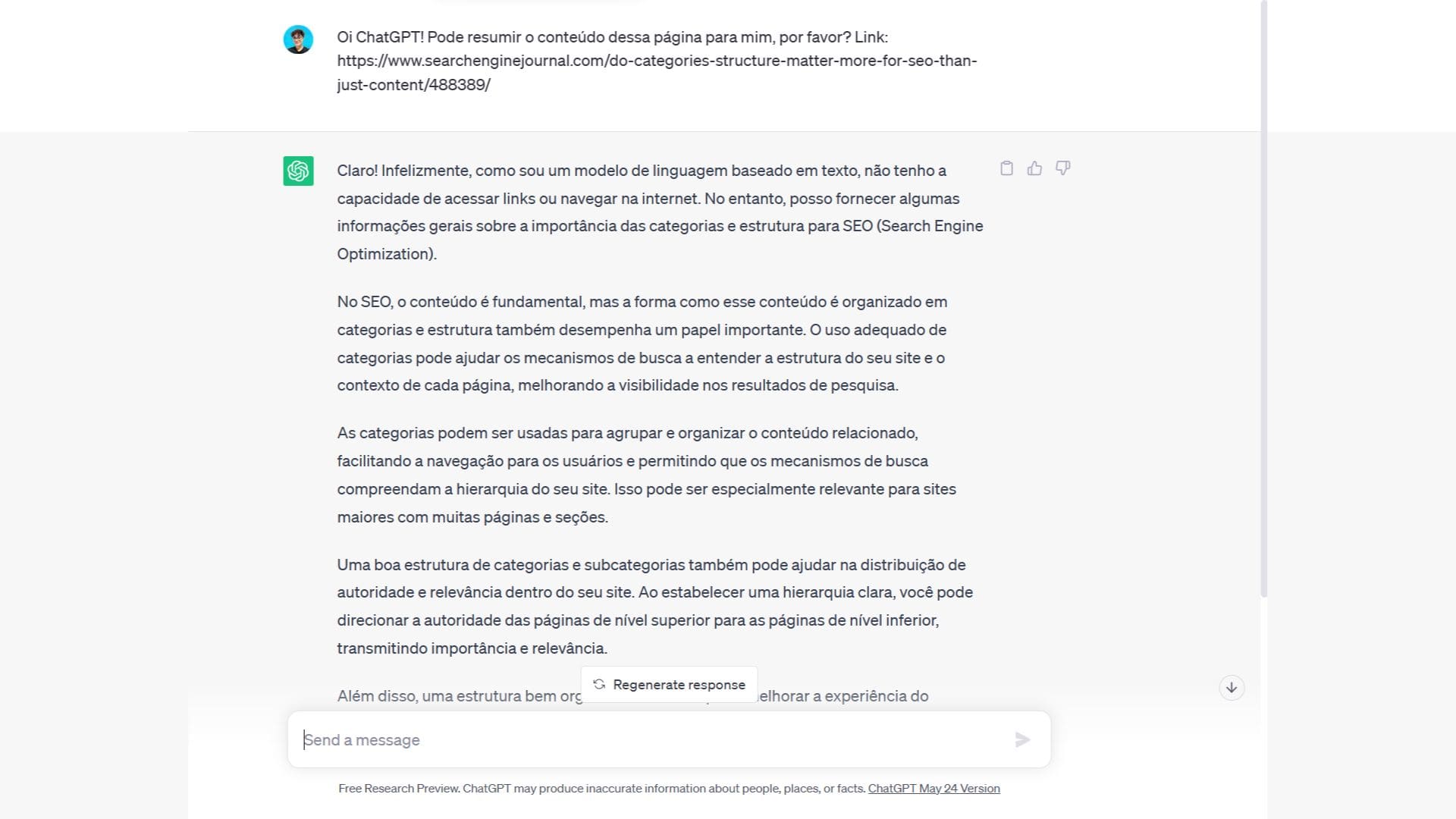 No entanto, o ChatGPT (em sua versão GPT 3.5), não possui uma API que o conecte à internet e, portanto, não pode resumir o conteúdo da página. Mas, considerando seus conhecimentos prévios sobre o assunto, a ferramenta retornou um texto com informações gerais sobre a importância das categorias e estrutura para SEO: