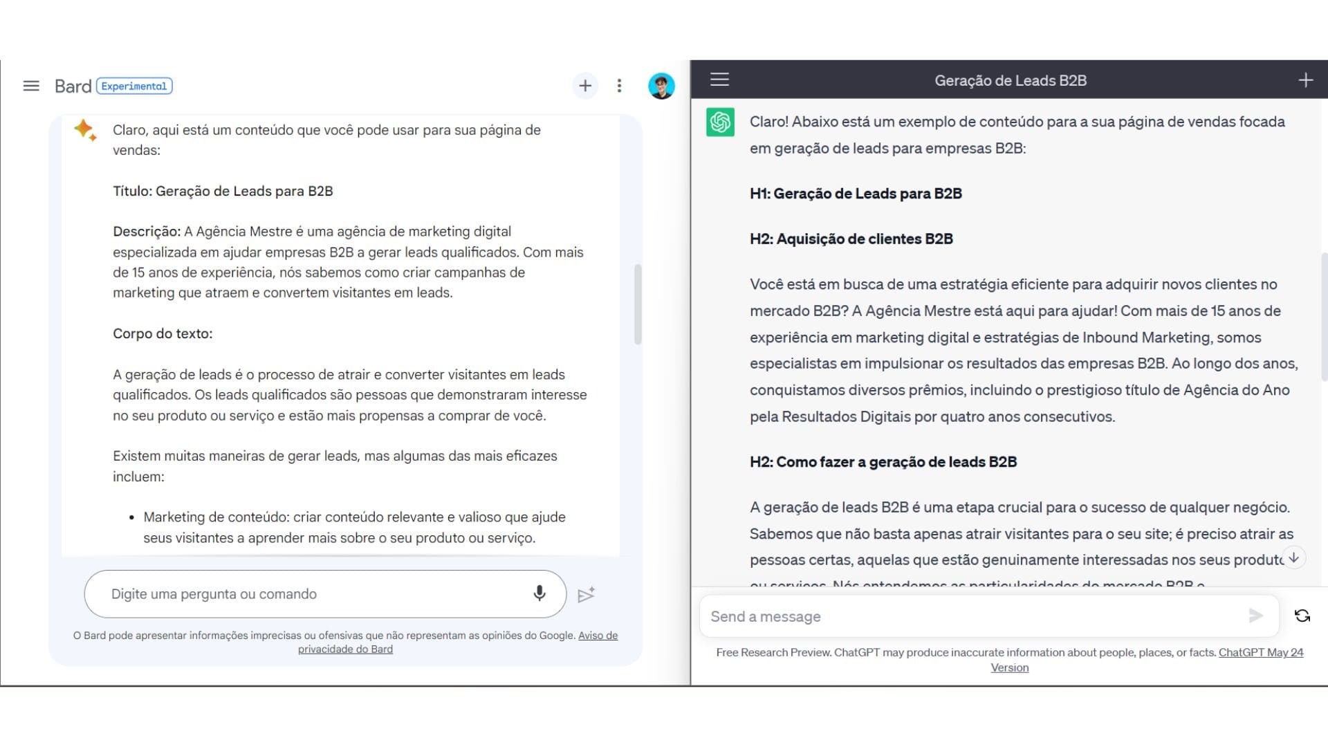 Fizemos algumas comparações com prompts e comandos iguais em ambos os buscadores conversacionais, e as respostas são semelhantes (mas, com alguns pontos que podem ser positivos ou negativos para o usuário que estiver buscando).