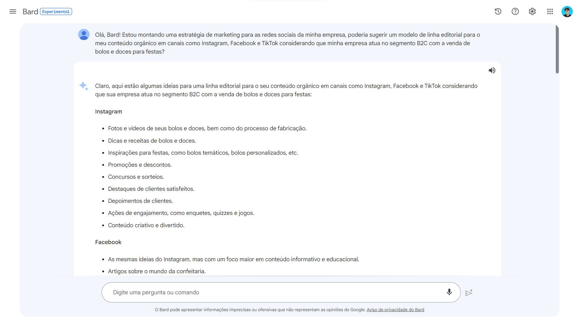Por isso, o buscador pede que os usuários enviem seus feedbacks sobre respostas incorretas ou não condizentes com o conteúdo informado. Em nosso primeiro chat, pedimos que o Bard criasse uma linha editorial para as redes sociais de uma empresa B2C do setor de confeitaria: