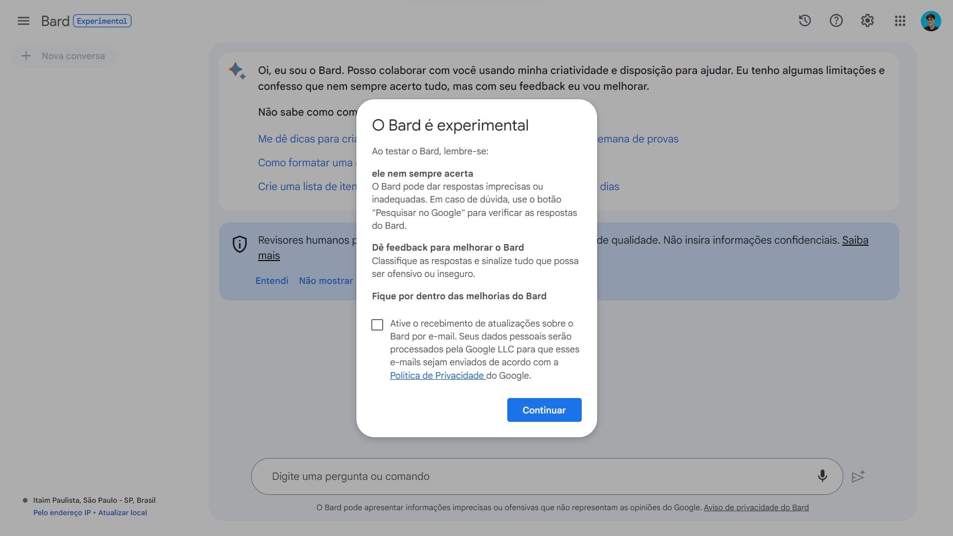 Ao iniciar o primeiro chat com a ferramenta, o Google exibe a sua Política de Privacidade e, em seguida, exibe um pop-up informando sobre as limitações e “problemas” do Bard. Como comentado anteriormente, o Bard está em seu modelo experimental e – portanto – ainda pode ter ocorrência de respostas incorretas.