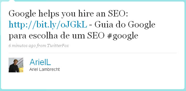 Hoje o Ariel Lambrecht, integrante da Equipe de Qualidade do Google de língua portuguesa juntamente com o Pedro Dias, enviou através do seu twitter o que ele chamou de “Guia do Google para escolha de um SEO #google” como você pode ver na imagem abaixo: