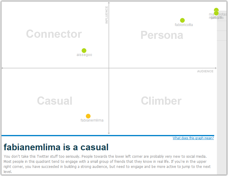 Dessa maneira, o Klout analisa o quão influente você é. Segundo meu teste, as pessoas mais influentes na minha rede são o fabioricotta, o aissegoo e o marcelotas – eu sou ainda uma usuária casual, que ainda não utiliza o Twitter com tanta freqüência quanto as outras pessoas.