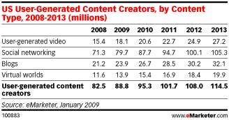Segundo pesquisas da eMarketer de janeiro de 2009, há uma previsão de crescimento do número de pessoas que criam conteúdo na internet a cada ano – e que grande parte desse aumento se deverá ao aumento de blogs – os principais usuários das redes sociais.