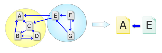 Nessa rede, os blogs em amarelo falam de um determinado assunto, os em azul, de assunto relacionado. Os líderes de opinião seriam os blogs A e E. Resumindo essa network, obteríamos a rede A<-E.