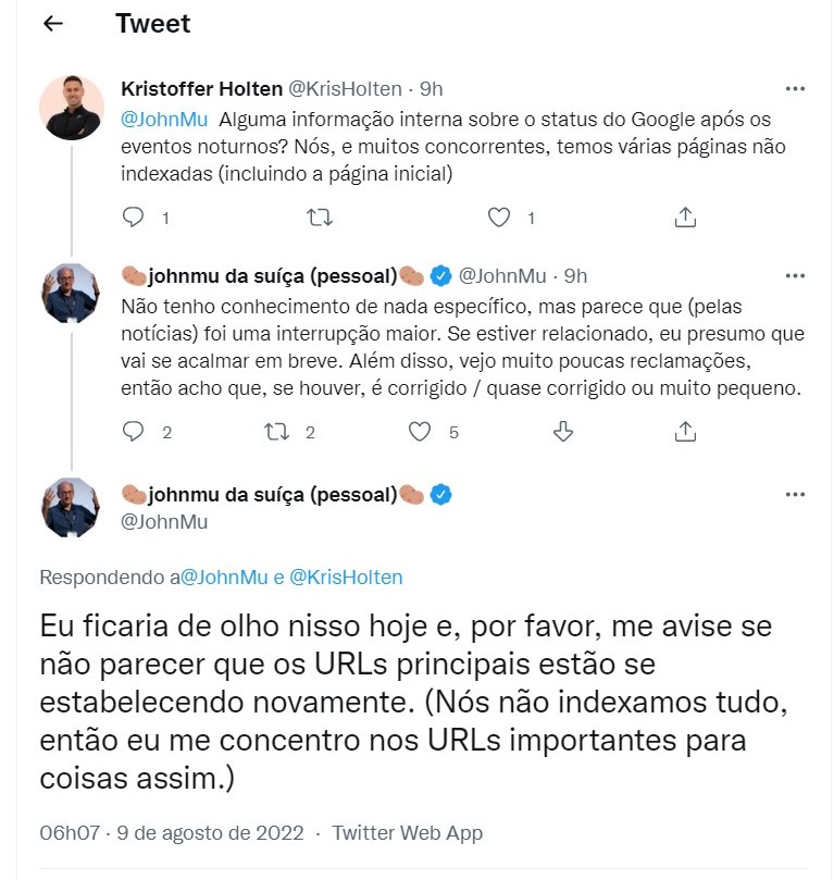 Agora, sobre os problemas relacionados a interrupção, John Mueller, do Google, comentou no Twitter sobre como as coisas devem voltar ao normal à medida que os esforços de restauração estão em andamento: