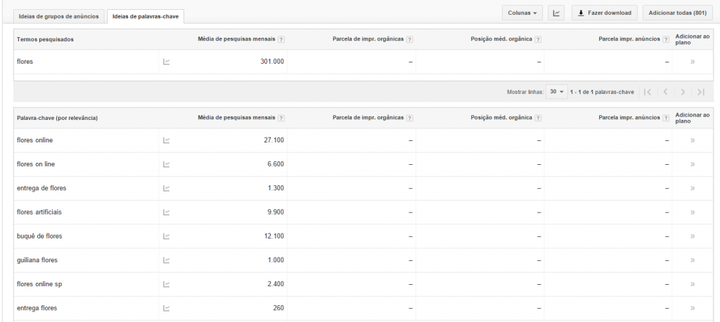 Uma ferramenta bastante útil nessa etapa é a Planejador de Palavras-Chave. Nela, insira uma lista de termos mais genéricos e mantenha selecionada a opção “utilizar sinônimos”. No exemplo abaixo, fiz uma pesquisa com as palavras “flores”:
