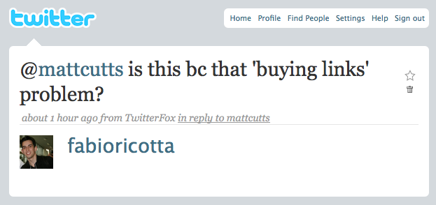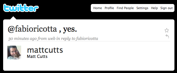 Alguns minutos atrás me deparei com esta twittada do Matt Cutts, o engenheiro chefe do time de Anti-Spam do Google:
