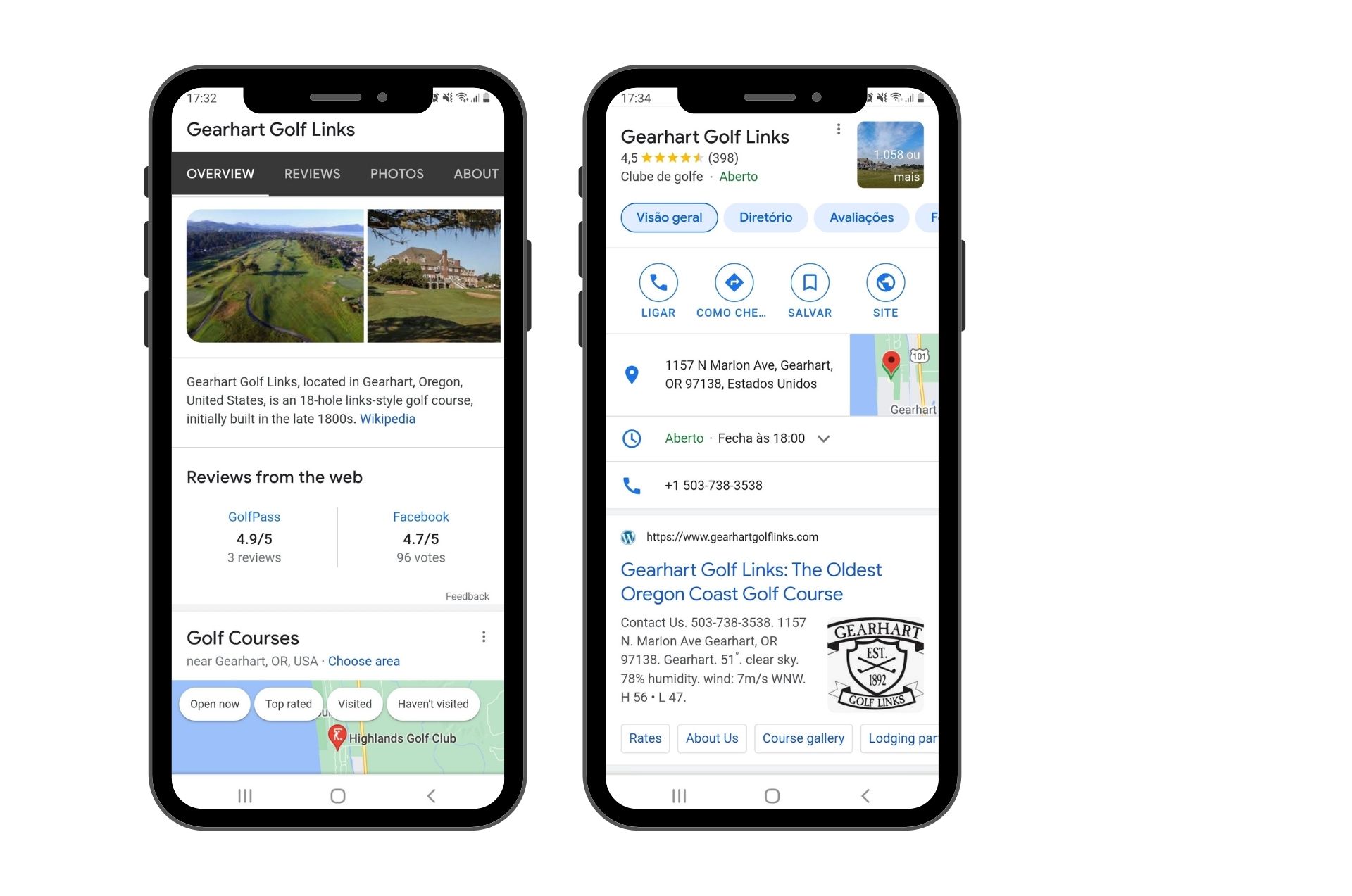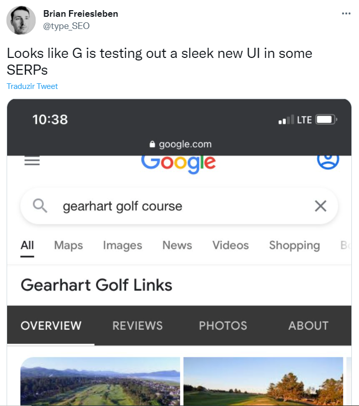 Brian Freiesleben, especialista em SEO, comentou sobre a atualização de layout no último sábado (05/02), em seu Twitter. Junto com o comentário, sugerindo que o Google estaria testando uma nova interface, Brian também compartilhou uma captura de tela que mostra um resultado de pesquisa para o termo “gearhart golf course” (“campo de golfe gearhart”)