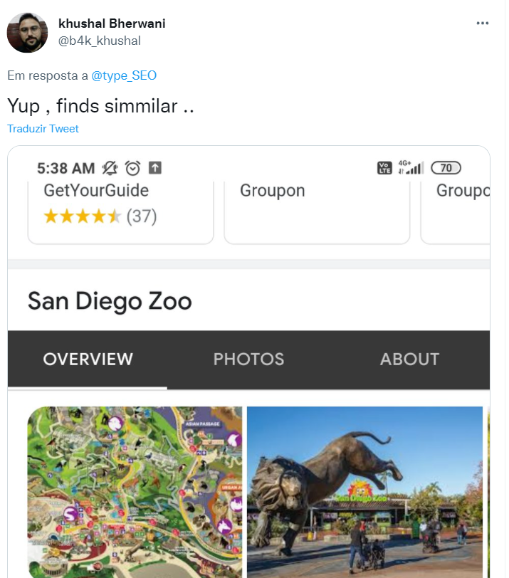 Em resposta, o analista Khushal Bherwani compartilhou uma captura de tela do resultado para “San Diego Zoo” (“Zoológico de São Diego”).