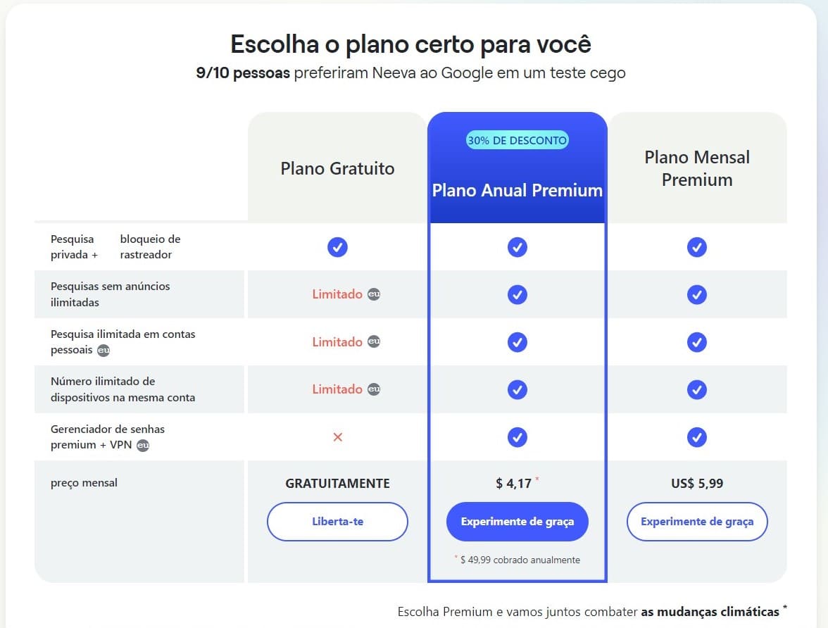 O Neeva oferece três modelos de planos para quem deseja criar uma conta no buscador. Sendo um gratuito e os outros dois pagos, contando com um desconto para o modelo anual de cobrança. Afinal, como não existem propagandas no Neeva, essa é a maneira da empresa lucrar.