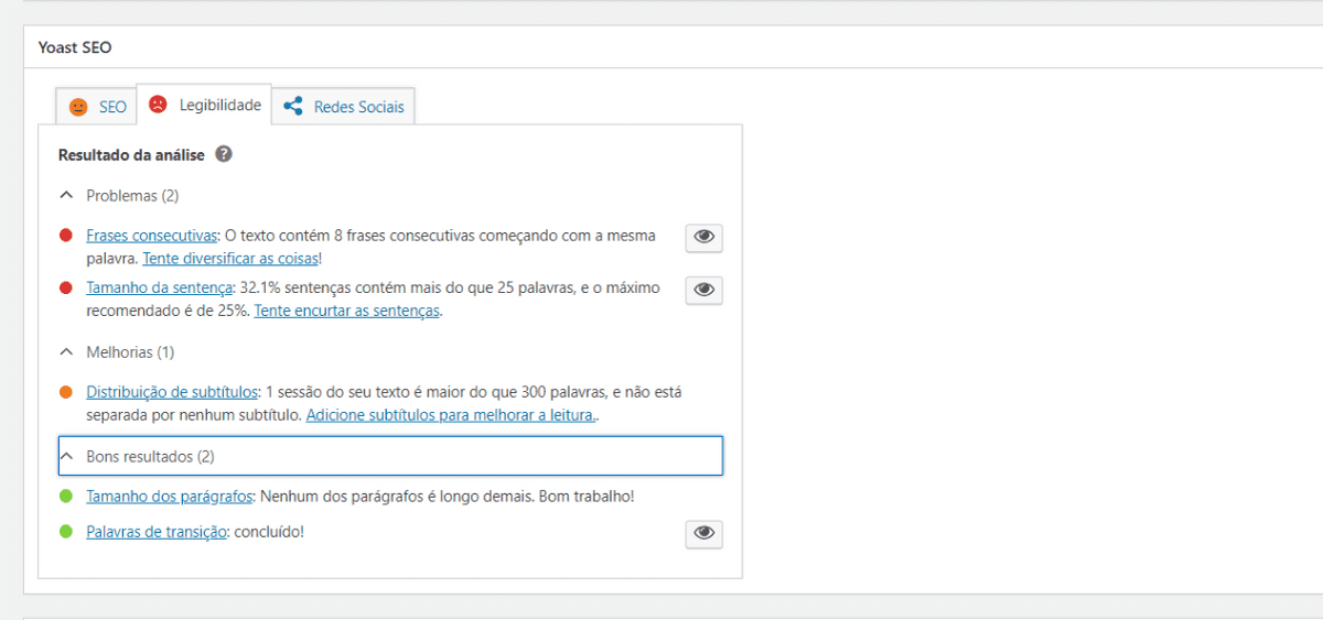 Existem ferramentas e plugins de análise que podem te ajudar a identificar problemas na utilização das palavras de transição. Um dos mais utilizados é o plugin Yoast SEO, pois ele entrega a análise on page completa e também um diagnóstico sobre a legibilidade daquele conteúdo.