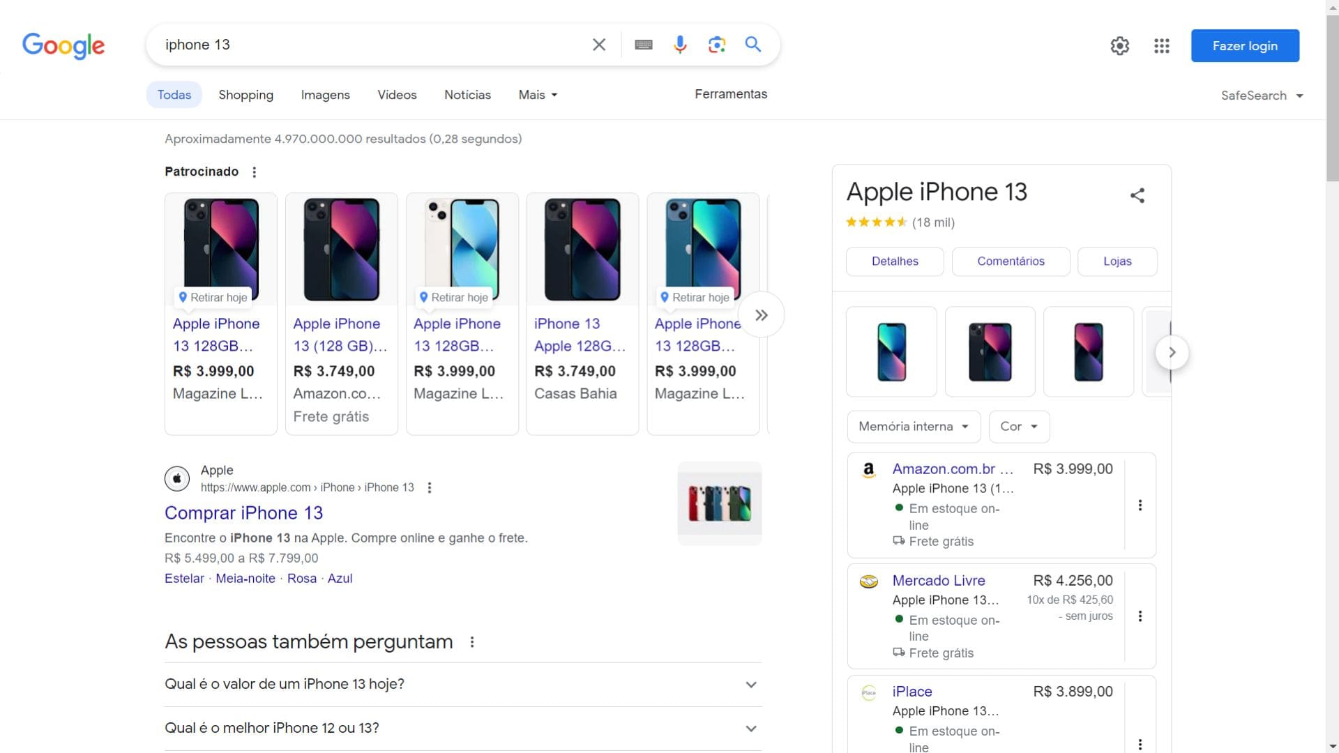 Como você pode ver, para a consulta “iphone 13”, o Google apresenta uma variedade de opções patrocinadas do Google Shopping na barra superior, resultados orgânicos e perguntas frequentes sobre o assunto e uma lista na lateral com mais opções de compra.