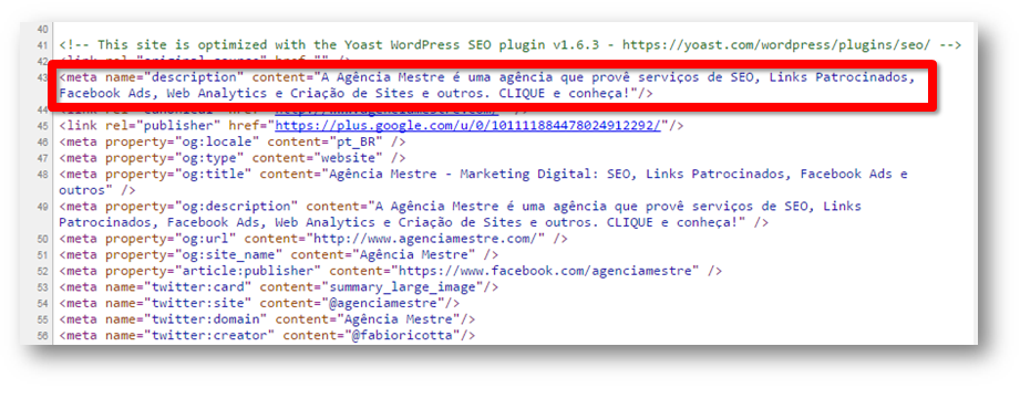 No código fonte da página, a meta description é inserida com a seguinte formatação: