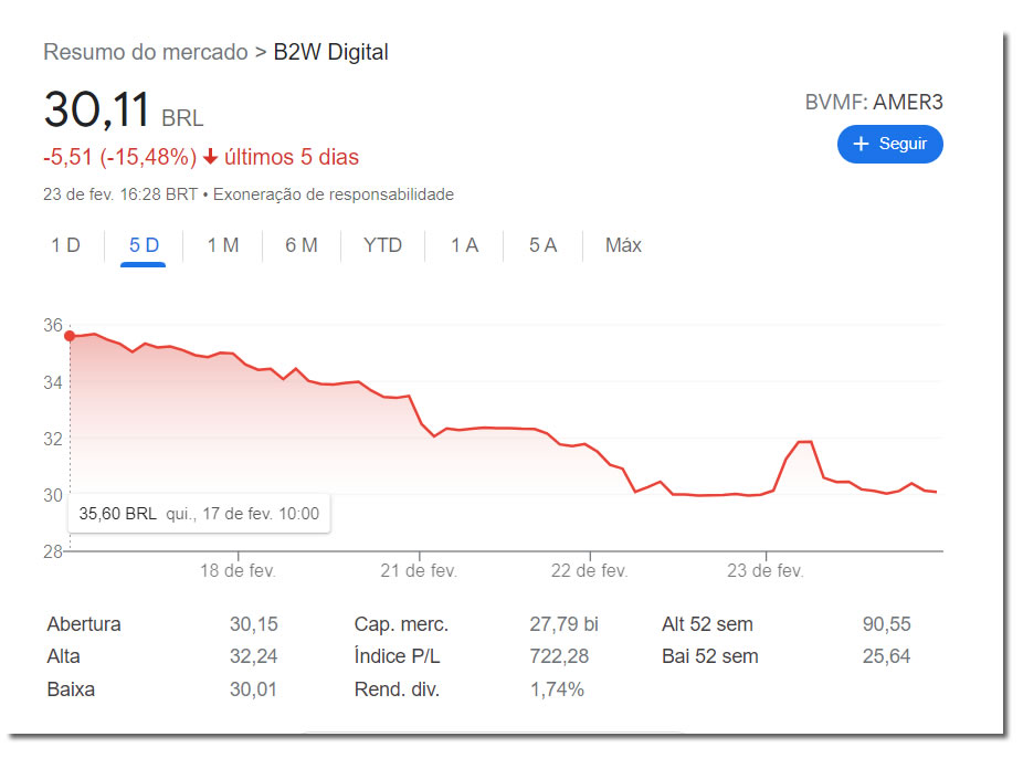 As ações do grupo B2W, que está listado na bolsa de valores com o ticker AMER3, chegaram amargar uma desvalorização de mais de 15% nos últimos 5 dias, ficando abaixo dos R$ 30,00 na cotação.