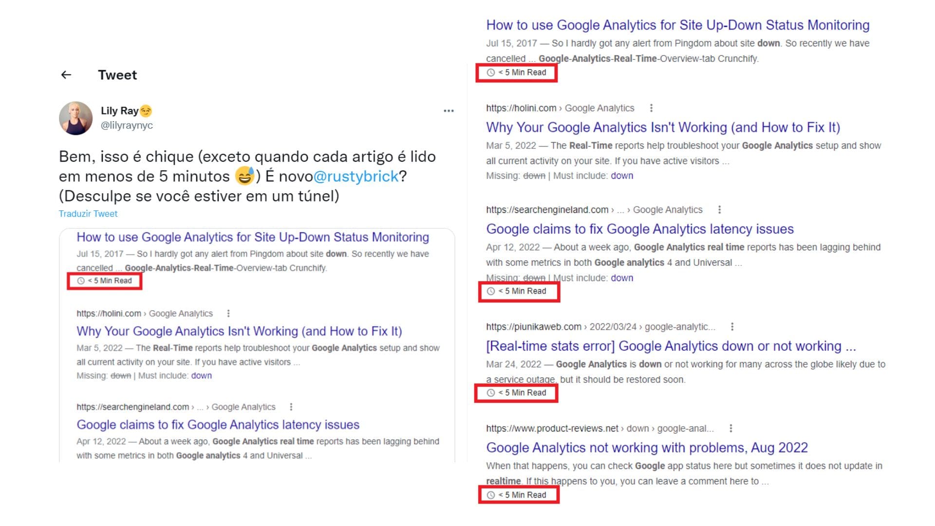 Na imagem compartilhada pela especialista, podemos ver que o buscador está informando aos usuários que alguns artigos podem ser lidos “em menos de cinco minutos (< 5 min read)”.