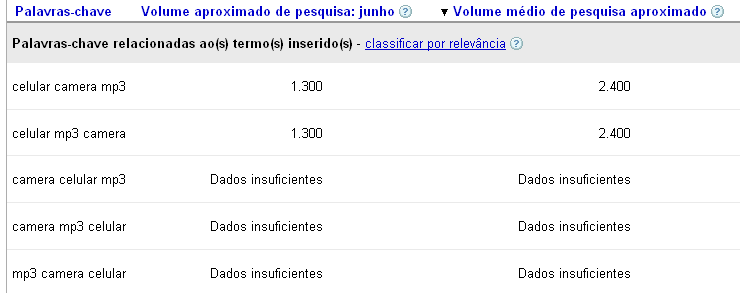 Não são dados excelentes, mas você tem uma idéia de que celular deve ser a primeira keyword na ordem.