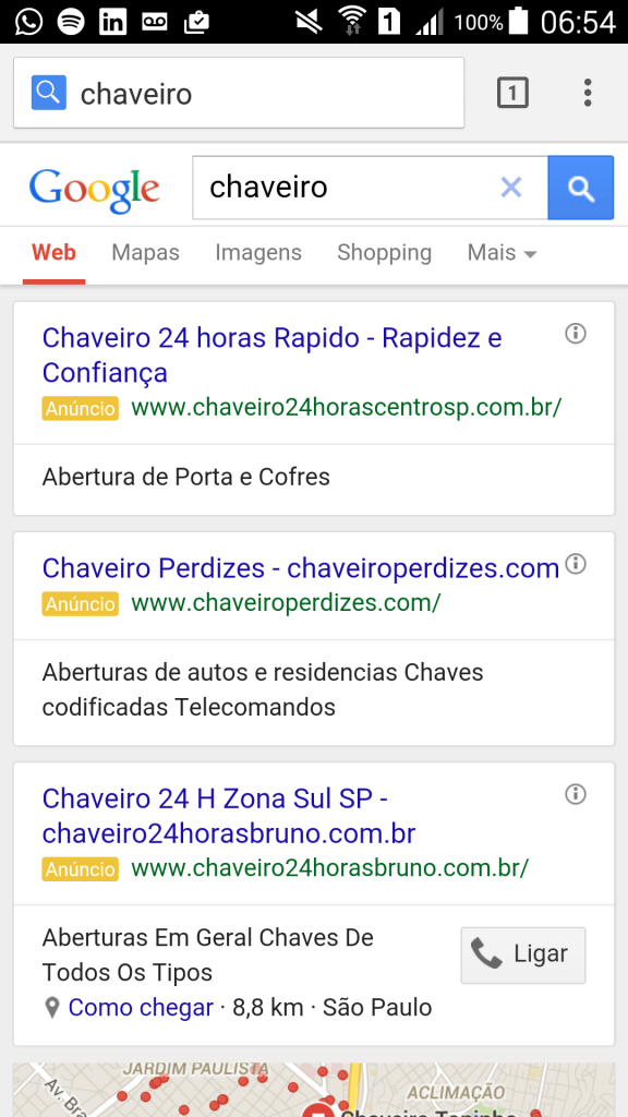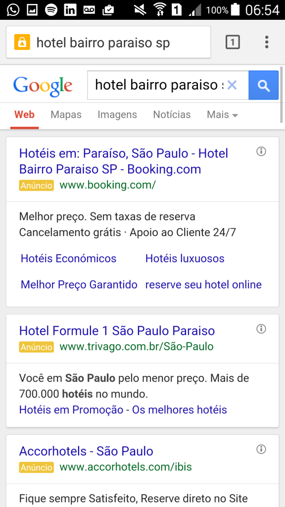 Contudo, o Google aumentou a incidência de buscas que ativam 3, e não 2, resultados patrocinados. Pude identificar isto em várias consultas: