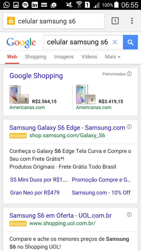 Também quando buscamos um produto tangível, conseguimos reproduzir vários resultados mostrando o Google Shopping acima dos resultados “bonificados”: