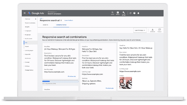 Para simplificar a revisão das campanhas o novo relatório de “Combinações” vai exibir sitelinks, frases de destaque e imagens ao lado de seus títulos e descrições: