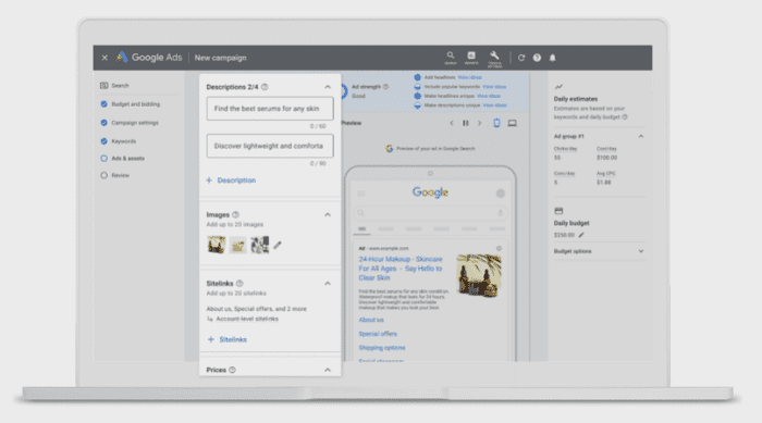 “À medida que você cria recursos e os aplica à sua campanha, a ferramenta de visualização é atualizada automaticamente para que você possa vê-los no contexto do seu anúncio. Além disso, o Google Ads agora recomendará recursos com base na meta de campanha escolhida. Por exemplo, se você selecionou ‘Leads’ como seu objetivo de campanha, recomendamos automaticamente que você adicione um recurso de formulário de lead.”