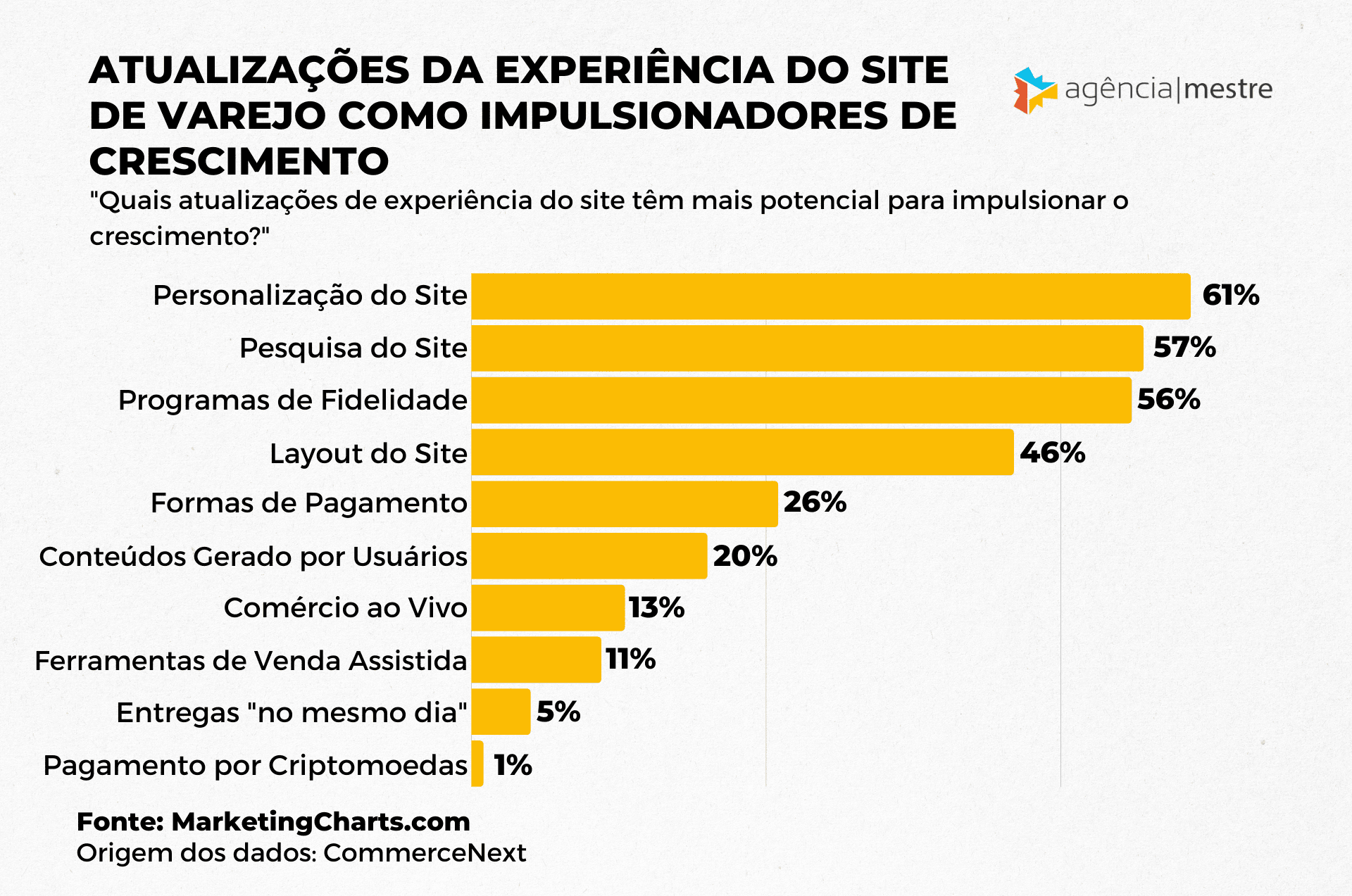 Para melhorar a experiência no site, a personalização é a aposta de 61% dos entrevistados que pretendem impulsionar as conversões. Além disso, os profissionais também pretendem potencializar sua pesquisa no site, visto que 94% dos consumidores americanos já abandonaram uma sessão de compras porque receberam resultados de pesquisa irrelevantes.