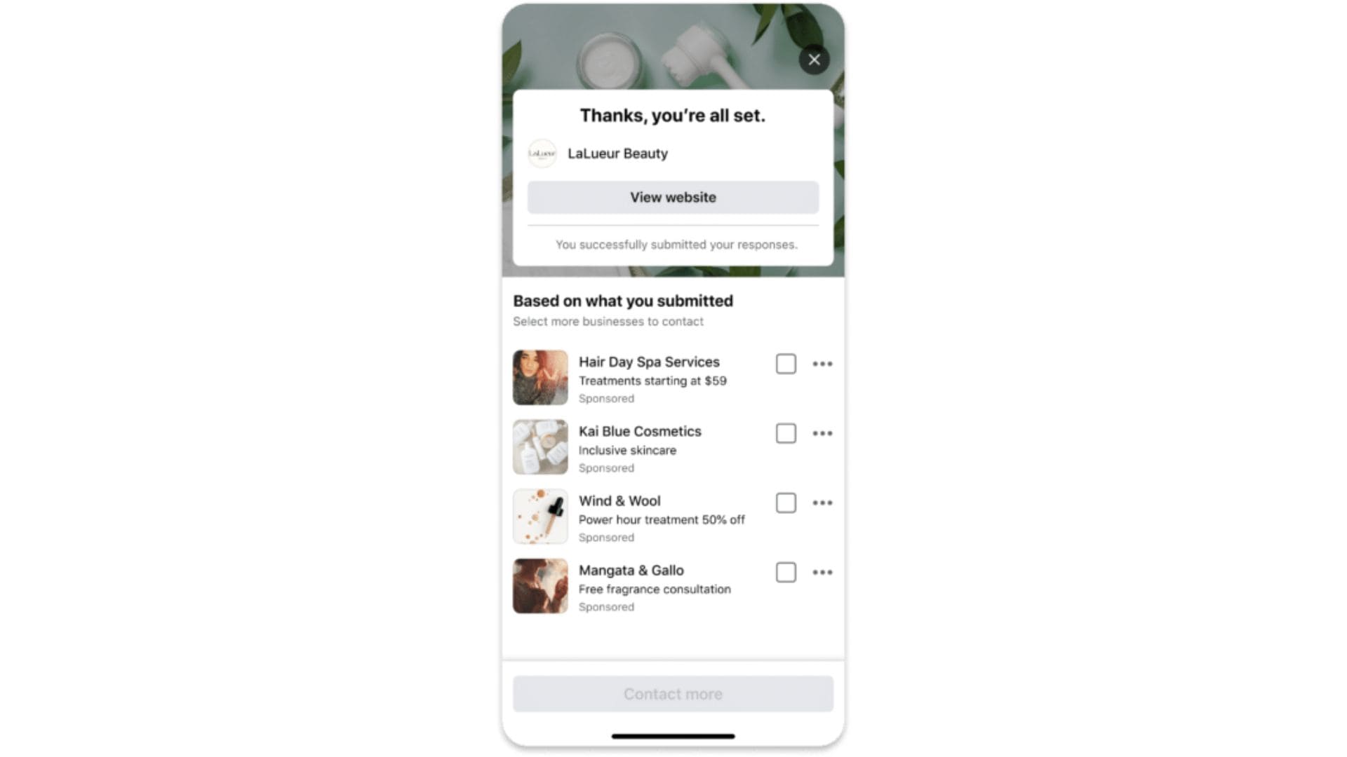 Conforme compartilhado pela Meta, essa novidade oferece maior comodidade para os usuários e oportunidades de descoberta para pequenas empresas. Ele funciona como um “catálogo” de opções relacionadas ao anúncio que o usuário acabou de converter: