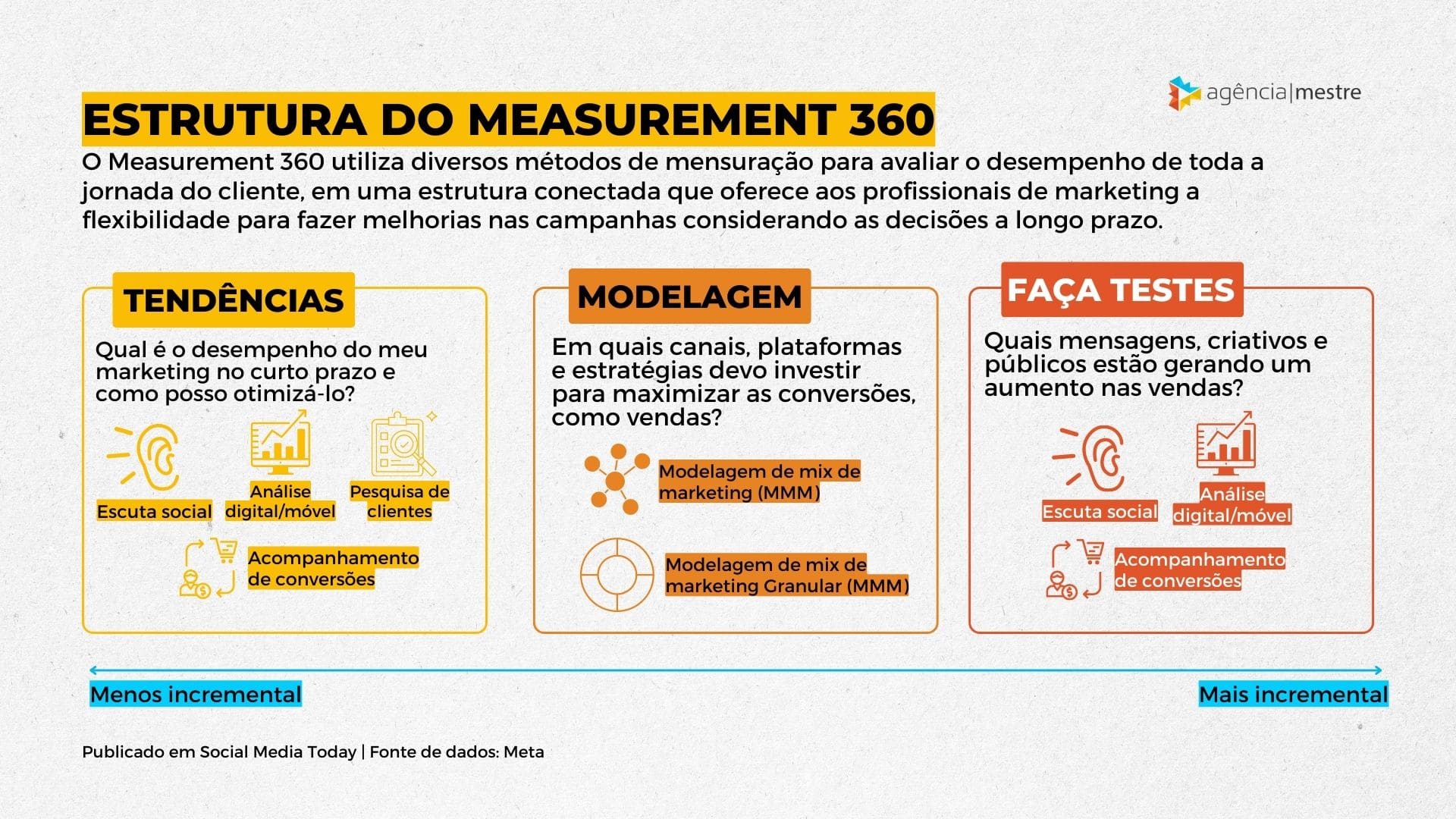 Basicamente, a estrutura proposta pelo Measurement 360 é incorporar ferramentas de análise para que, em conjunto, elas ofereçam uma visão completa sobre o escopo das estratégias de tráfego pago das redes sociais da Meta (Facebook e Instagram), de forma que os anunciantes possam identificar os marcos de sucesso e repeti-los no futuro.