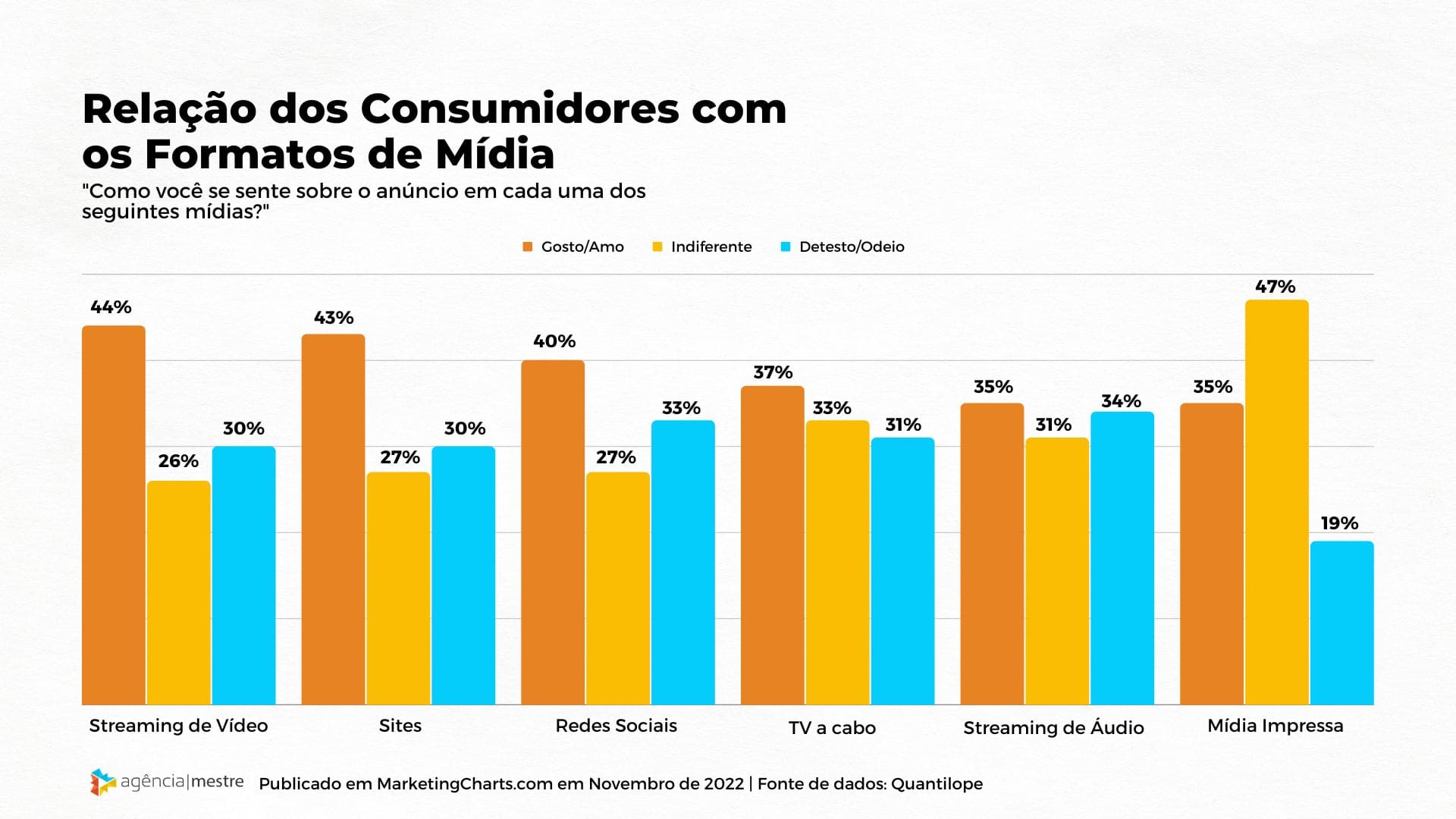 Os anúncios “preferidos” dos consumidores podem ser considerados: plataformas de streaming de vídeo, em sites e nas redes sociais (44%, 43% e 40% respectivamente). Não apenas esses formatos se destacam com relação aos demais, como a porcentagem de pessoas que detestam está, pelo menos, 10 pontos percentuais abaixo.